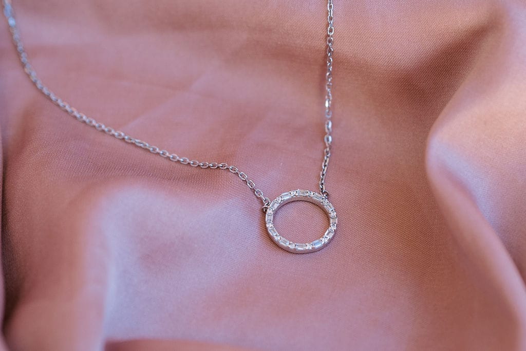 Circular pendant encrusted with small cubic zirconia stones on a fine silver chain.
