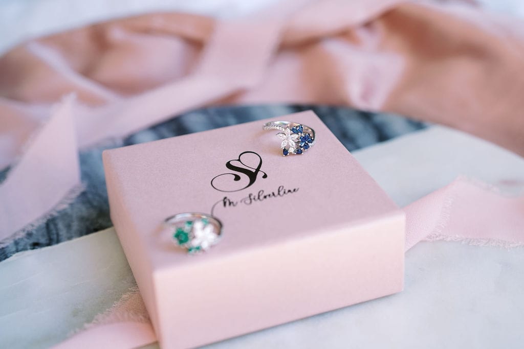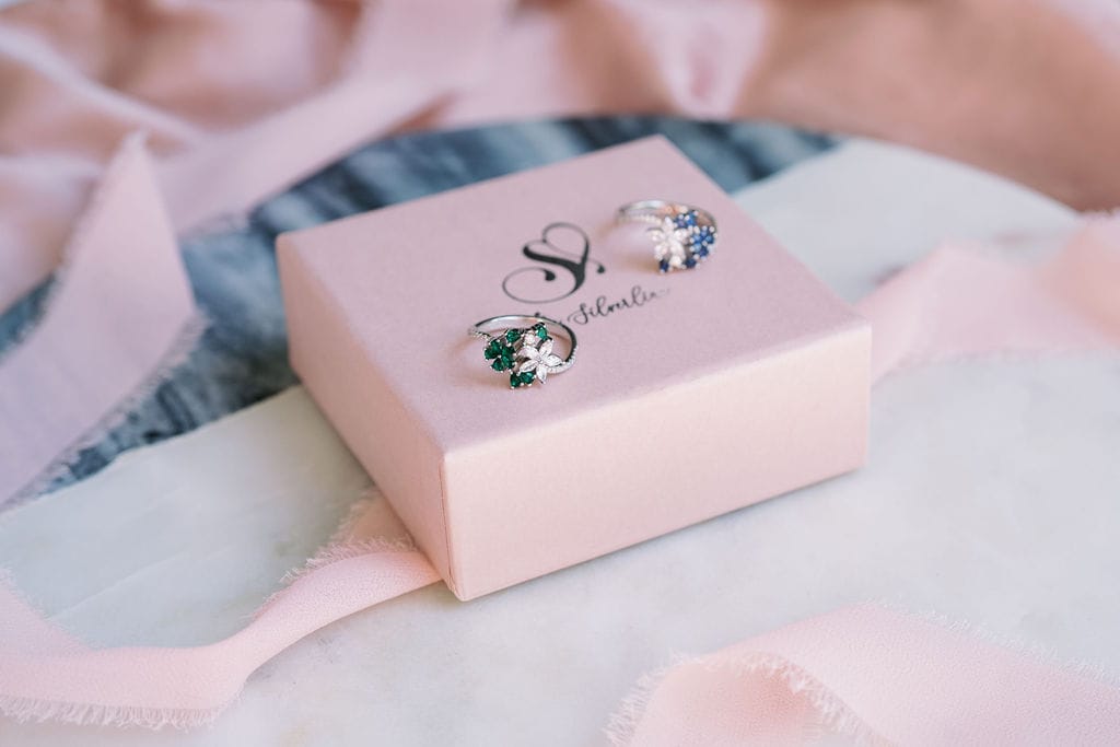Floral designs adorned with green and blue gemstones. Perfect for adding a pop of color to your outfit.