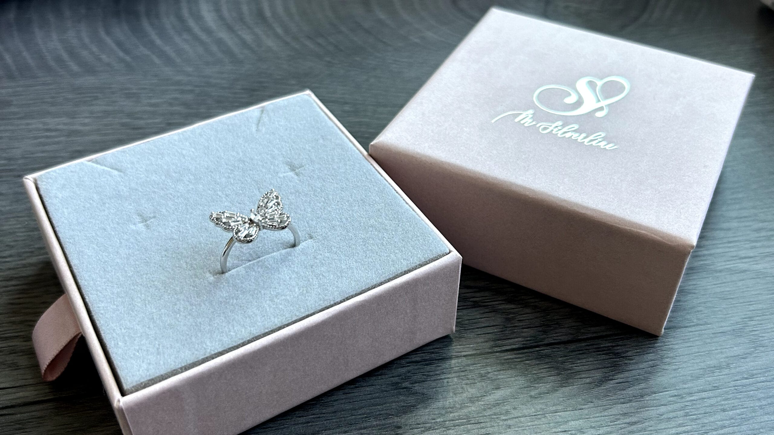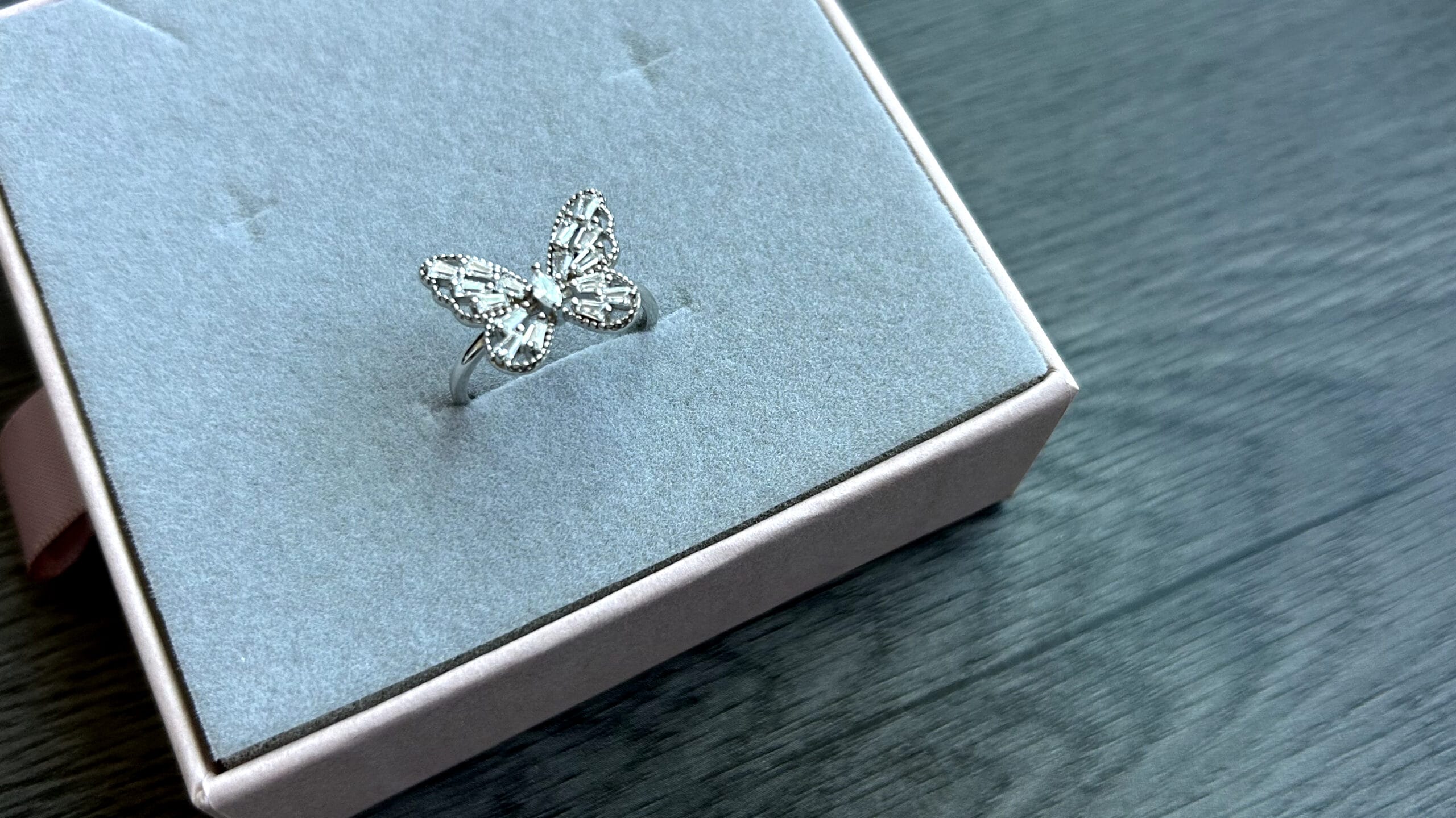 A stunning butterfly-shaped ring with delicate wings intricately set with baguette-cut stones, symbolizing elegance and freedom.