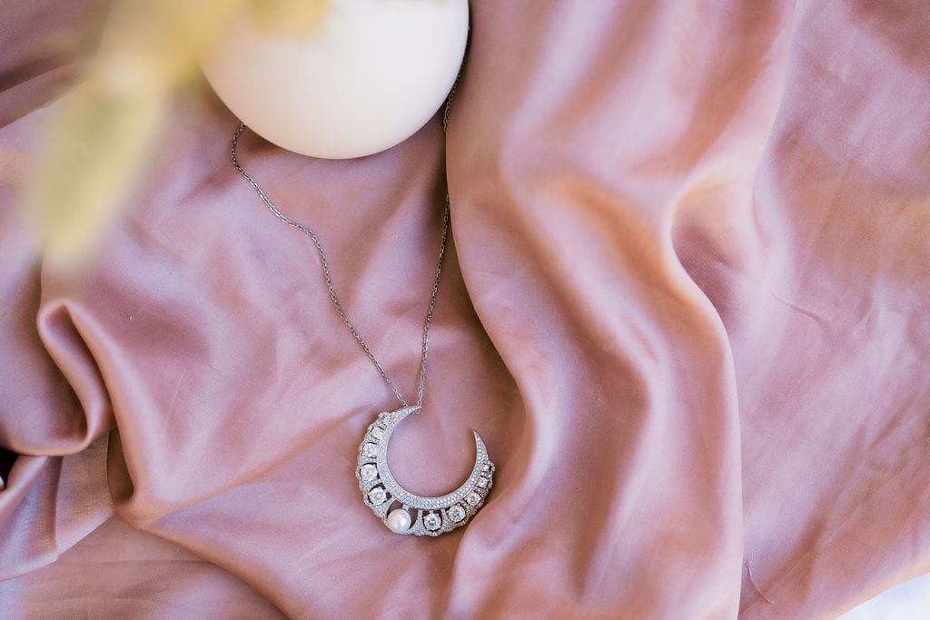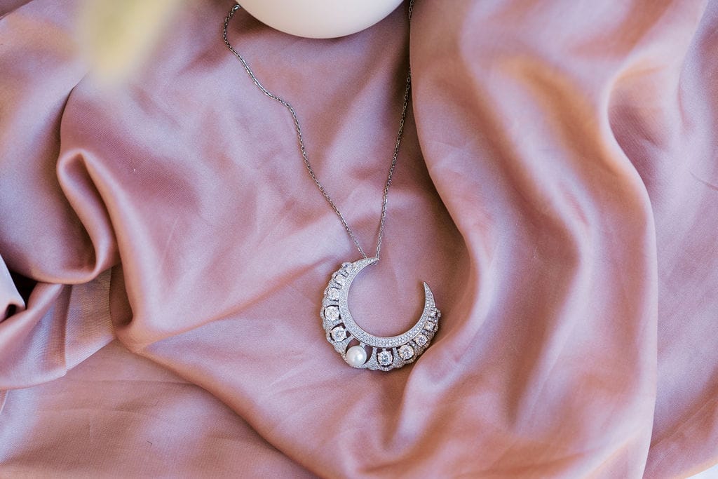 Hilal Necklace carries a blend of elegance and celestial charm, adorned with sparkling diamond-like stones along its curve. At the base of the crescent sits a delicate pearl, adding a soft, lustrous touch to the piece.
