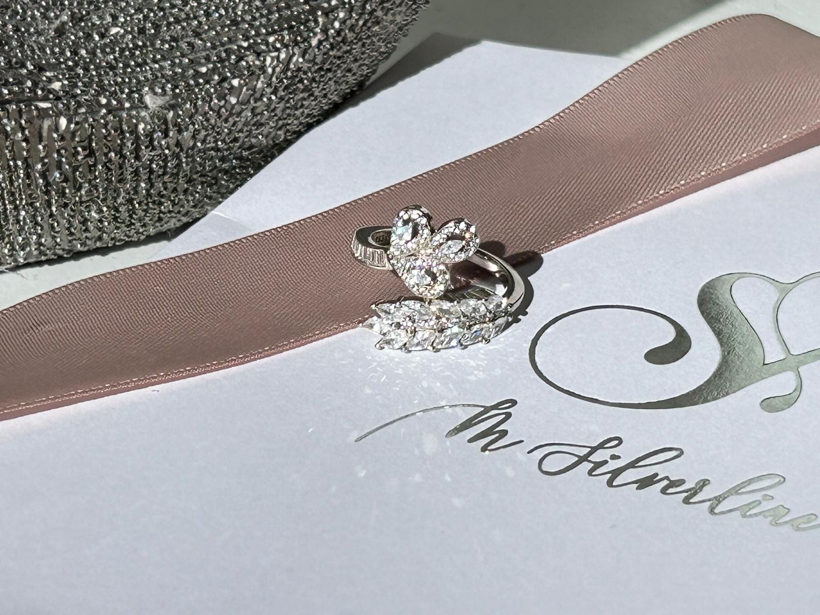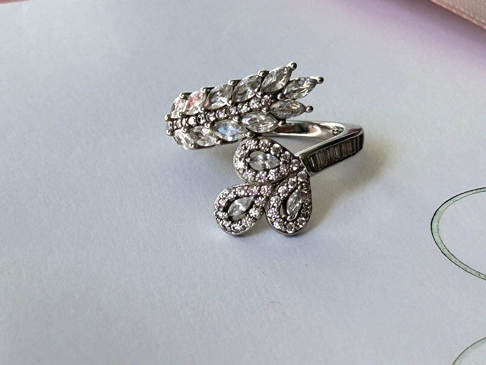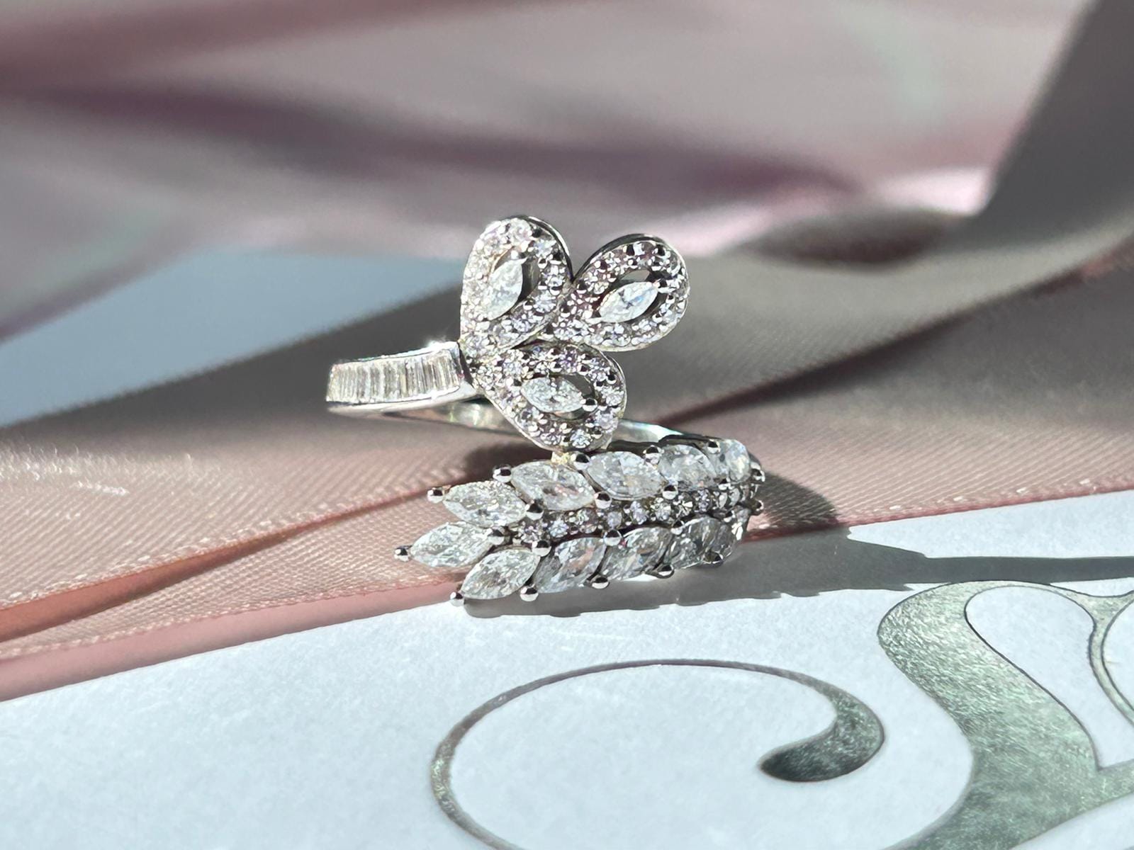 This exquisite dual-style ring combines a blooming floral motif with a delicate leaf-inspired design, creating a harmonious blend of nature and elegance. The floral centerpiece sparkles with clustered stones, while the leaf motif adds intricate detailing.