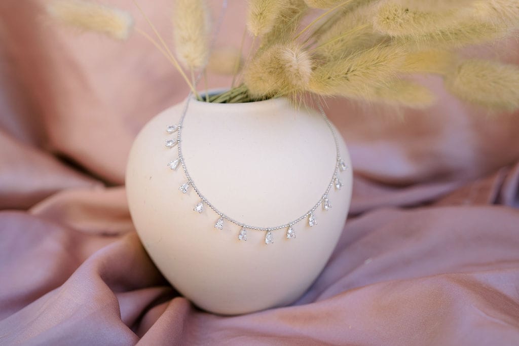 A delicate choker-style necklace featuring small teardrop-shaped gems evenly spaced along a fine chain.