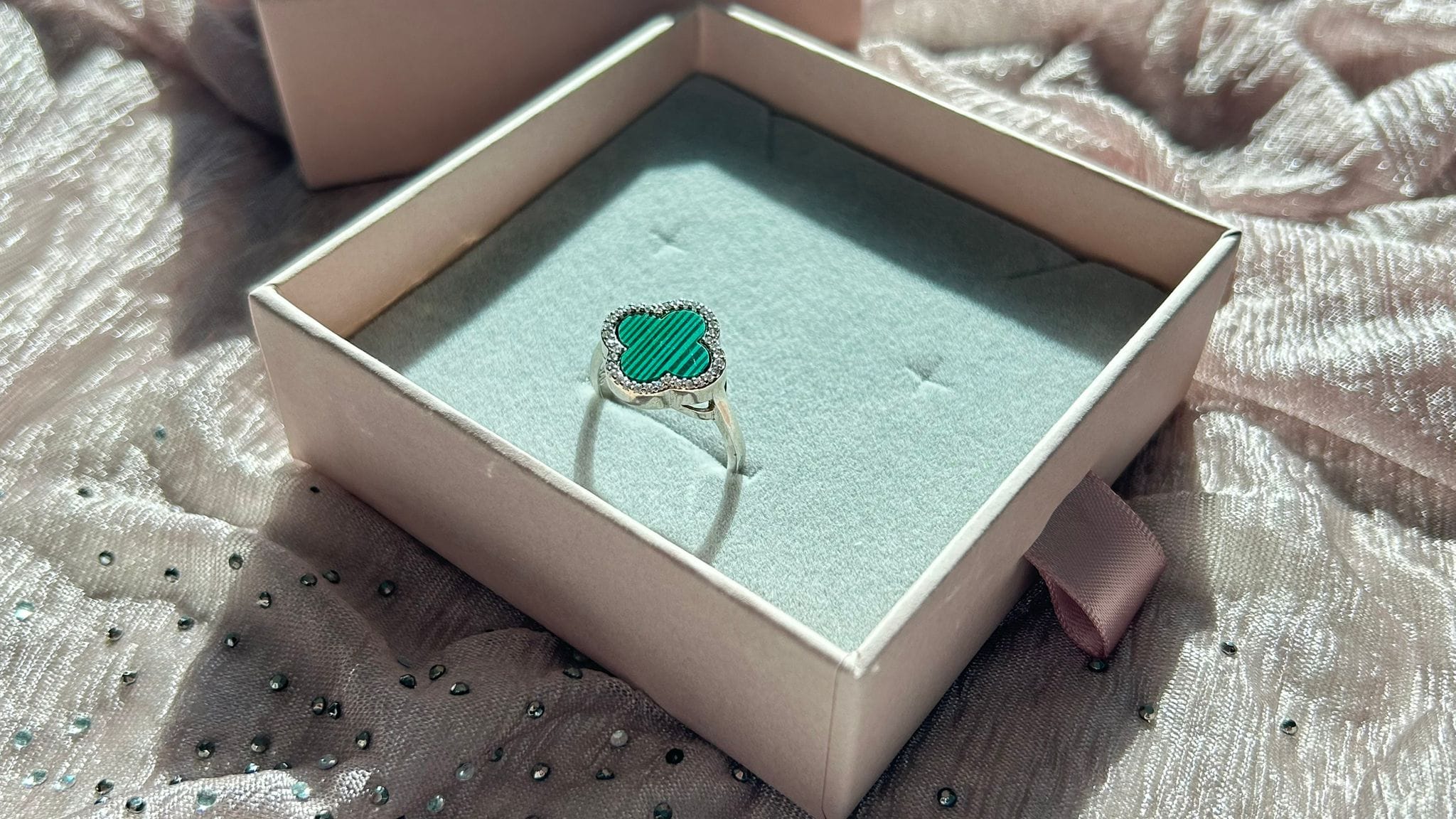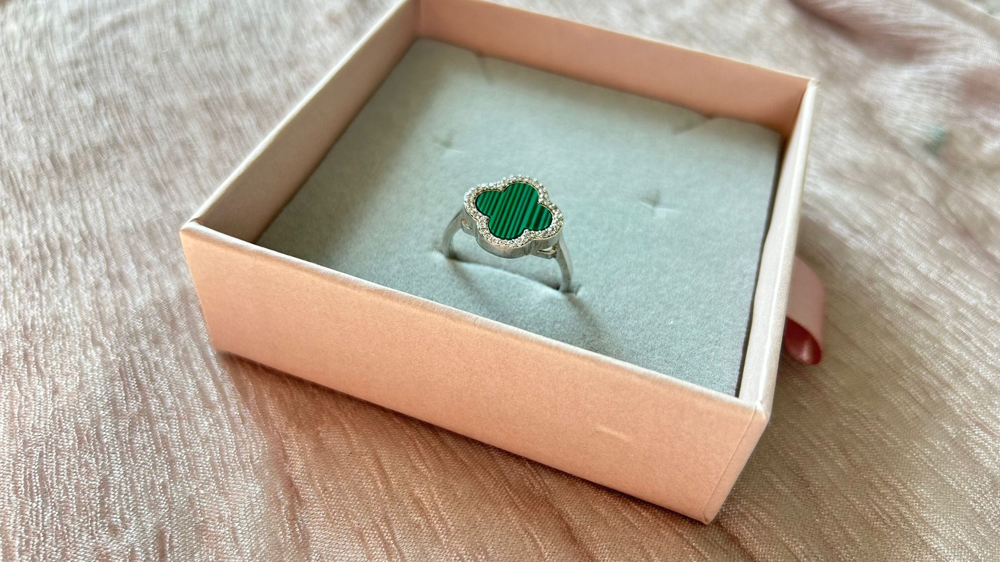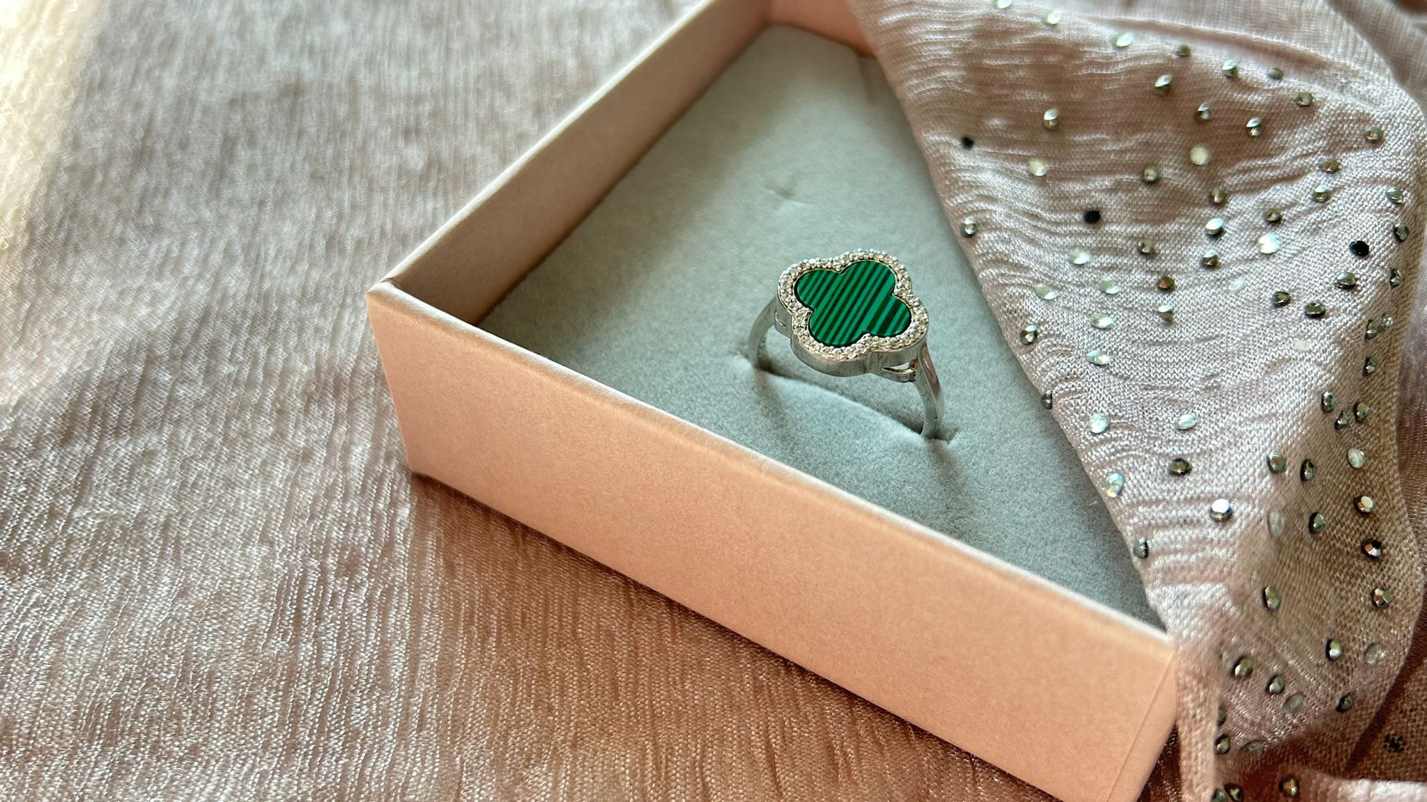 A statement piece featuring a clover-shaped malachite stone framed with delicate silver detailing, symbolizing luck and harmony.