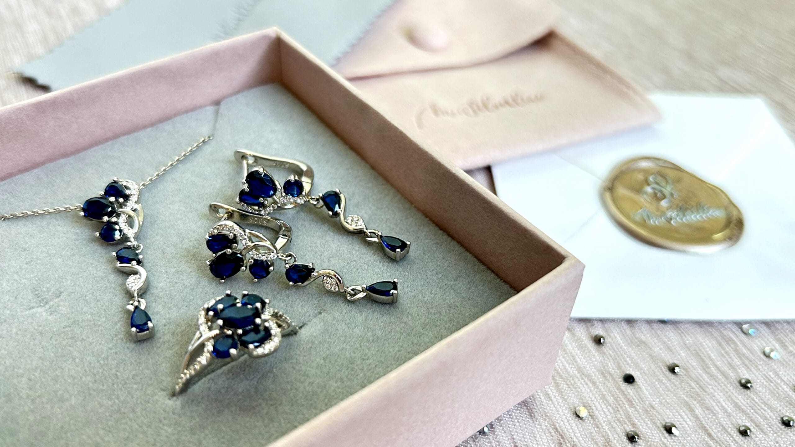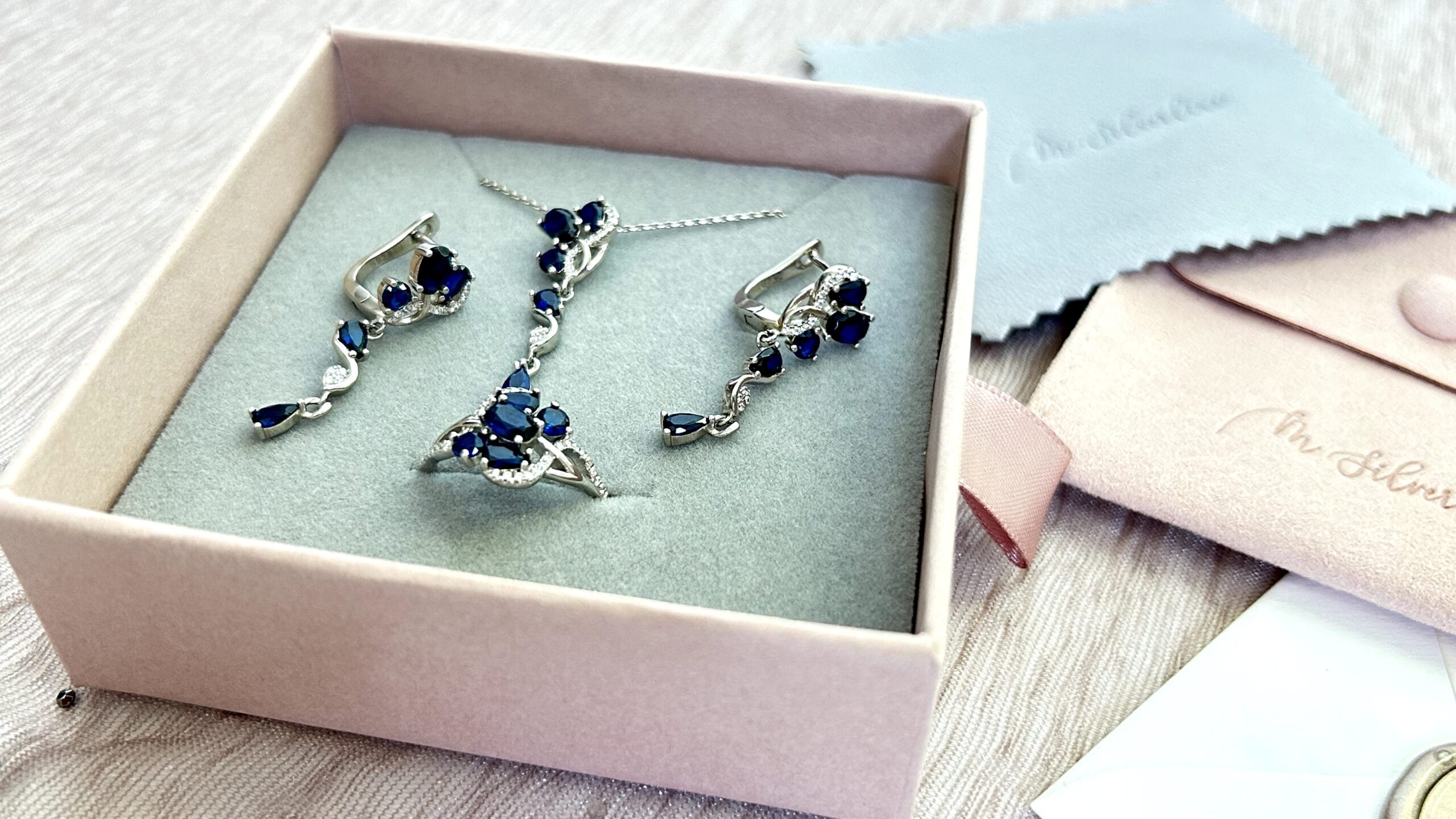 | Gemstone | Deep blue synthetic sapphire stones paired with brilliant-cut cubic zirconia for a radiant effect. |