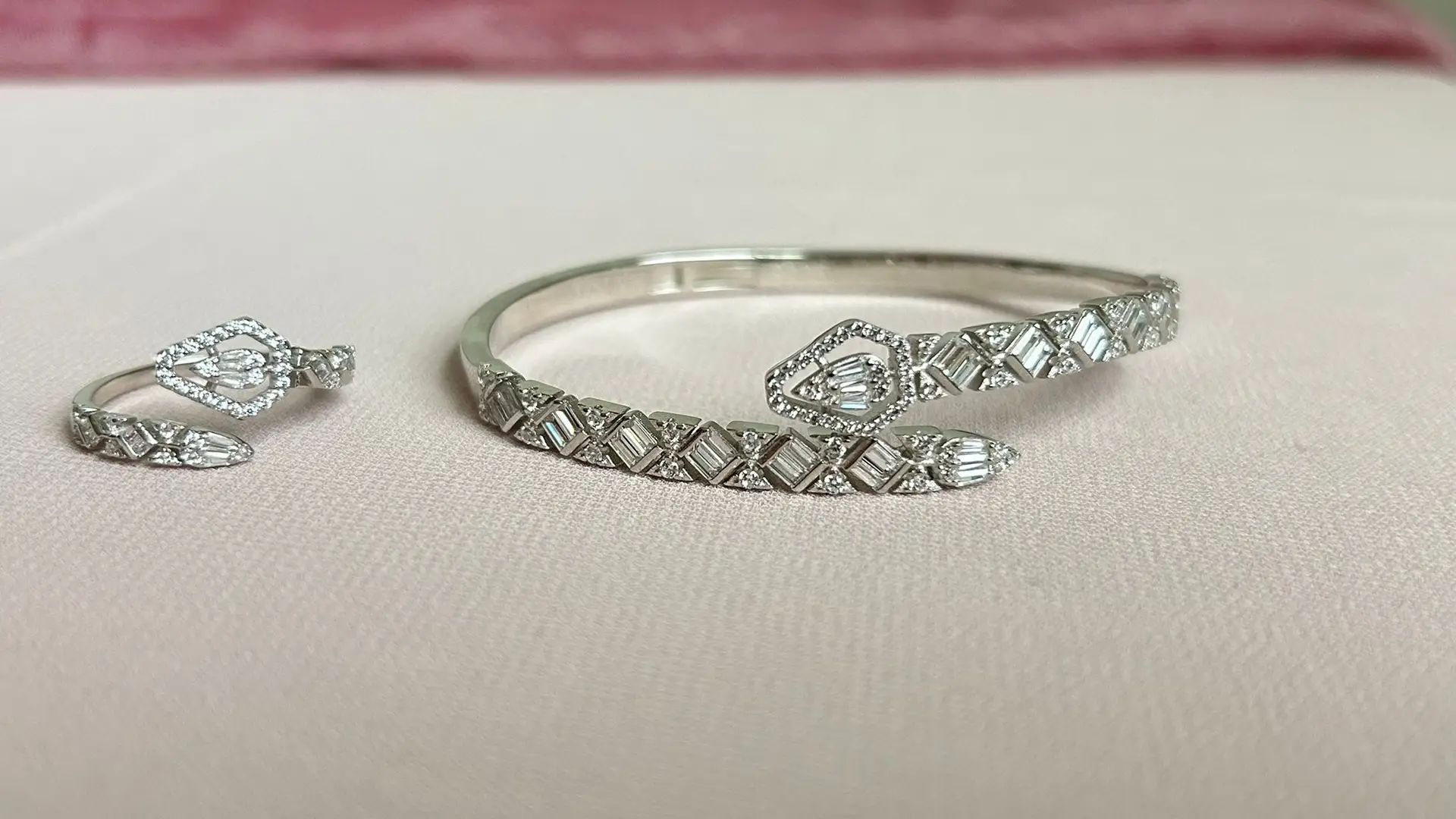 This sleek minimalist set includes a bangle and a matching ring. Both pieces are subtly enhanced with a line of pave-set cubic zirconia, adding a touch of sparkle without overpowering the refined design.