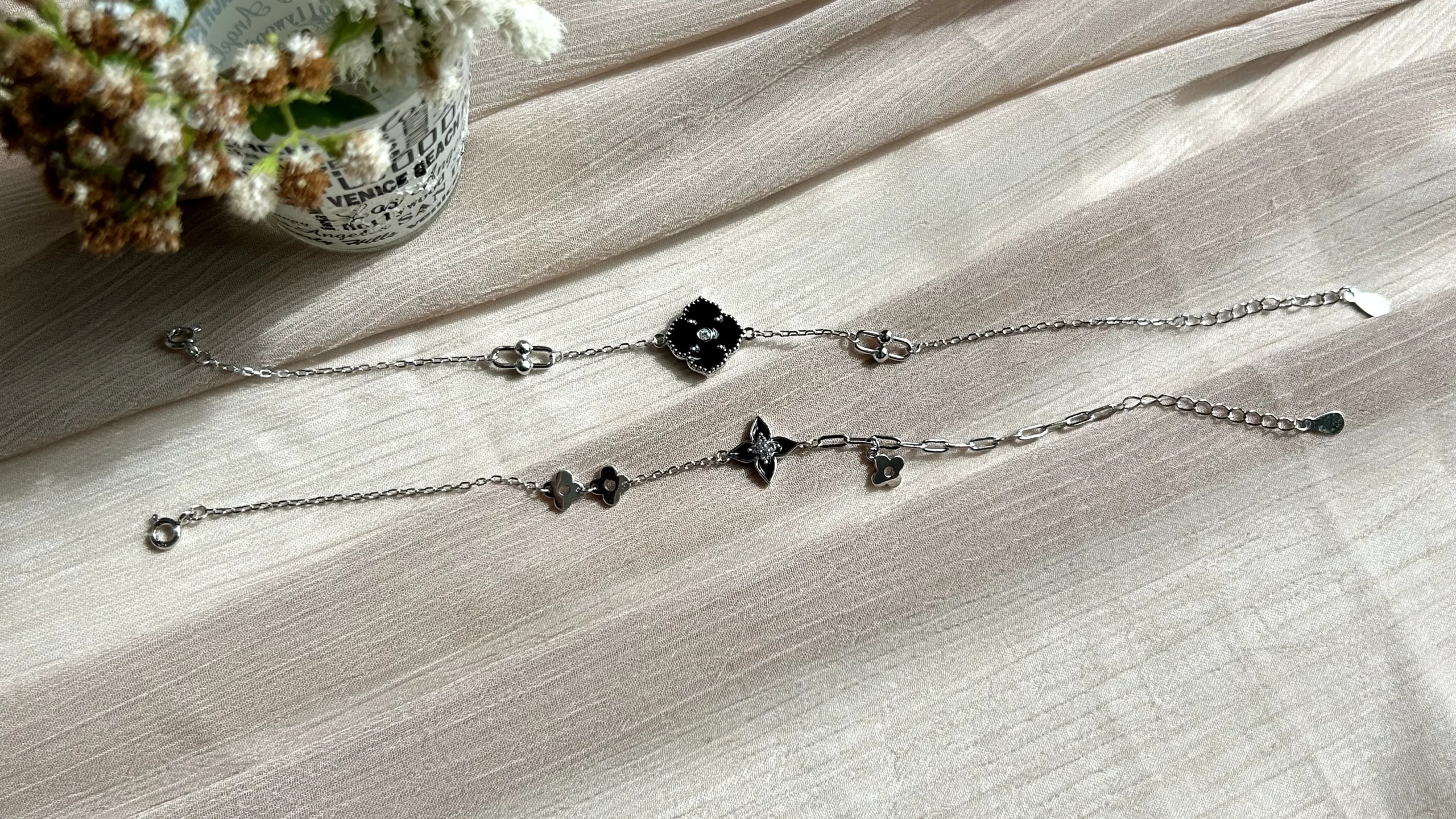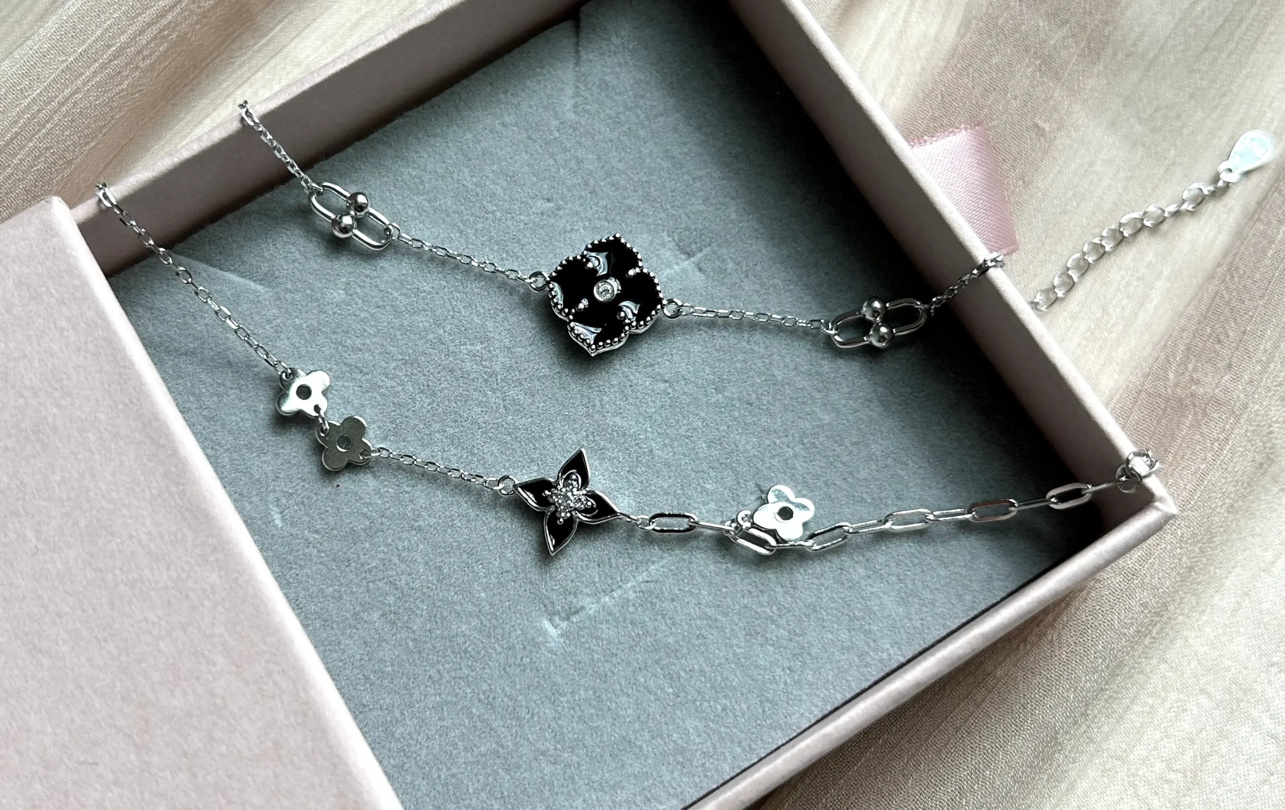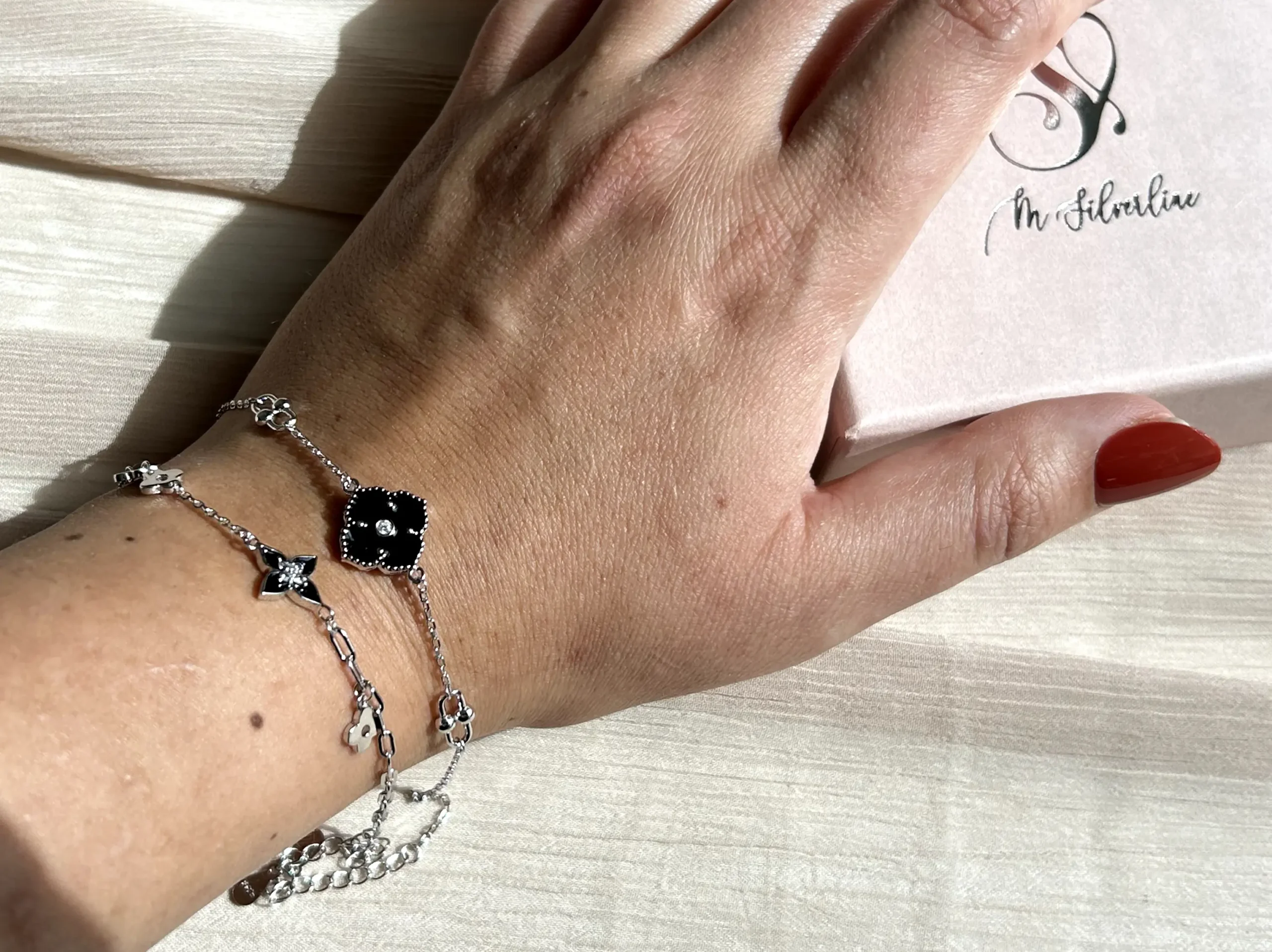 This bracelet features a mix of black and silver floral motifs with intricate details. The main floral element is black with a crystal accent in the center, surrounded by smaller silver flower charms along the chain. The design combines elegance with a touch of boldness.