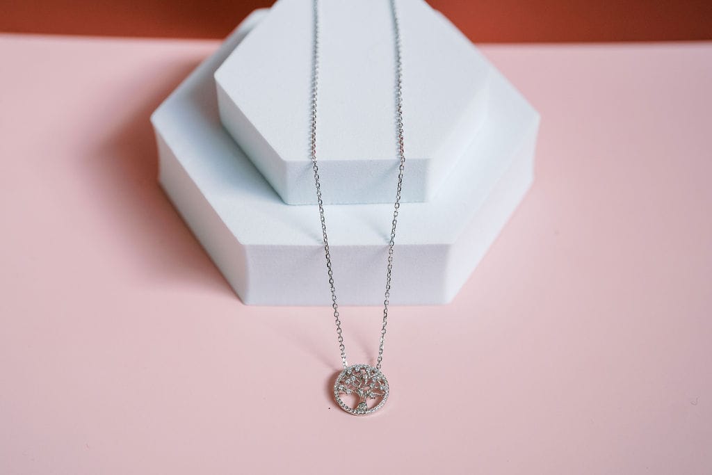 This round pendant necklace features the Tree of Life design encrusted with sparkling cubic zirconia stones, symbolizing growth and connection.