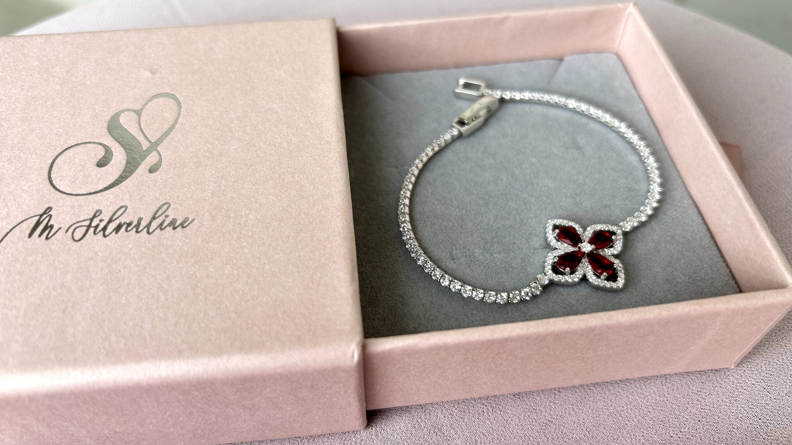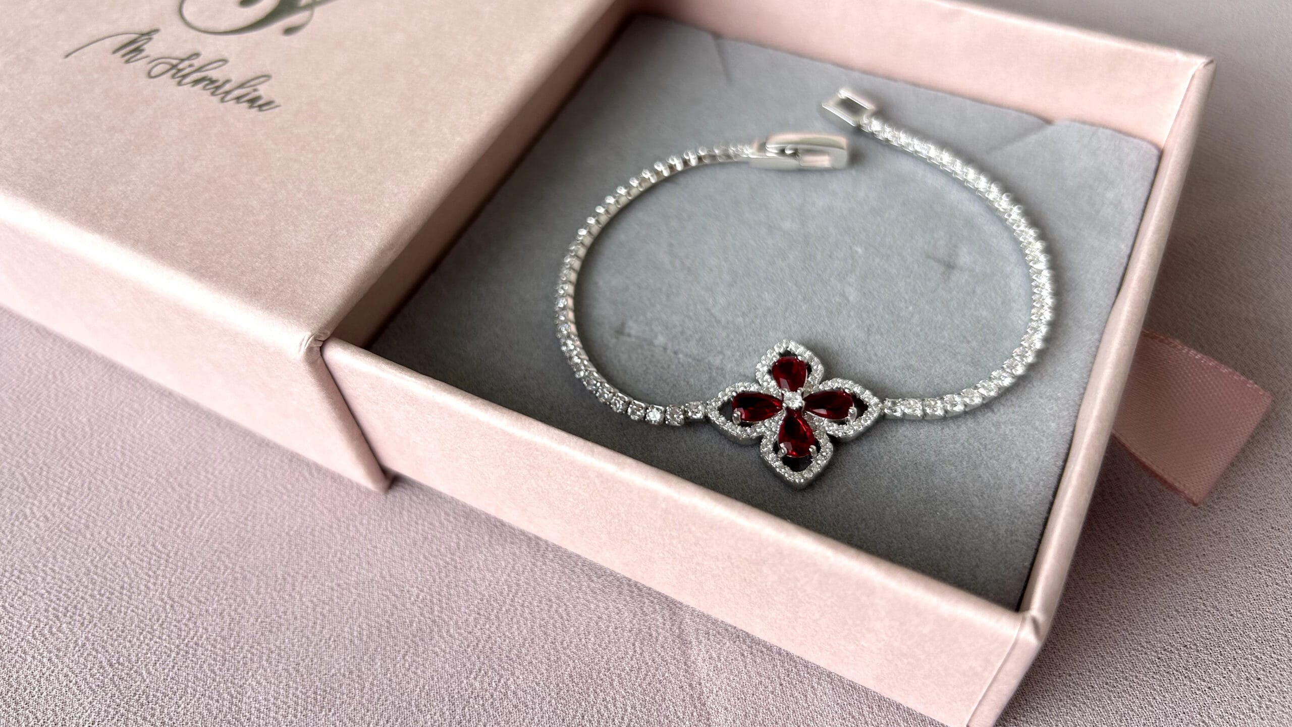 This elegant bracelet showcases a series of ruby-colored floral clusters interspersed with marquise-shapes clear crystals. Suitable for all occasions.