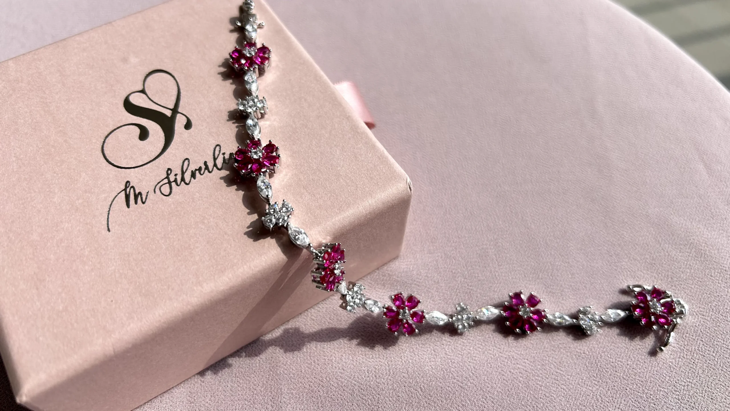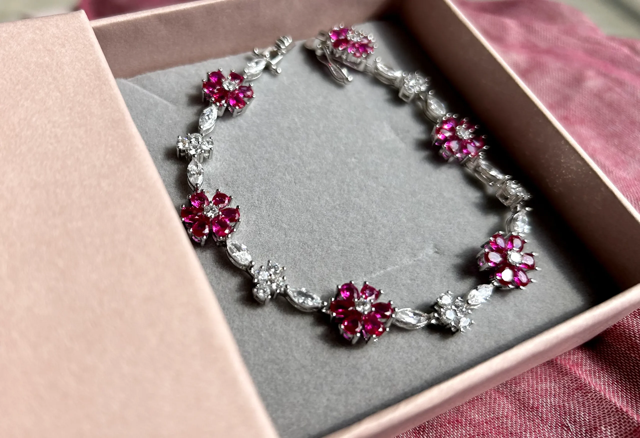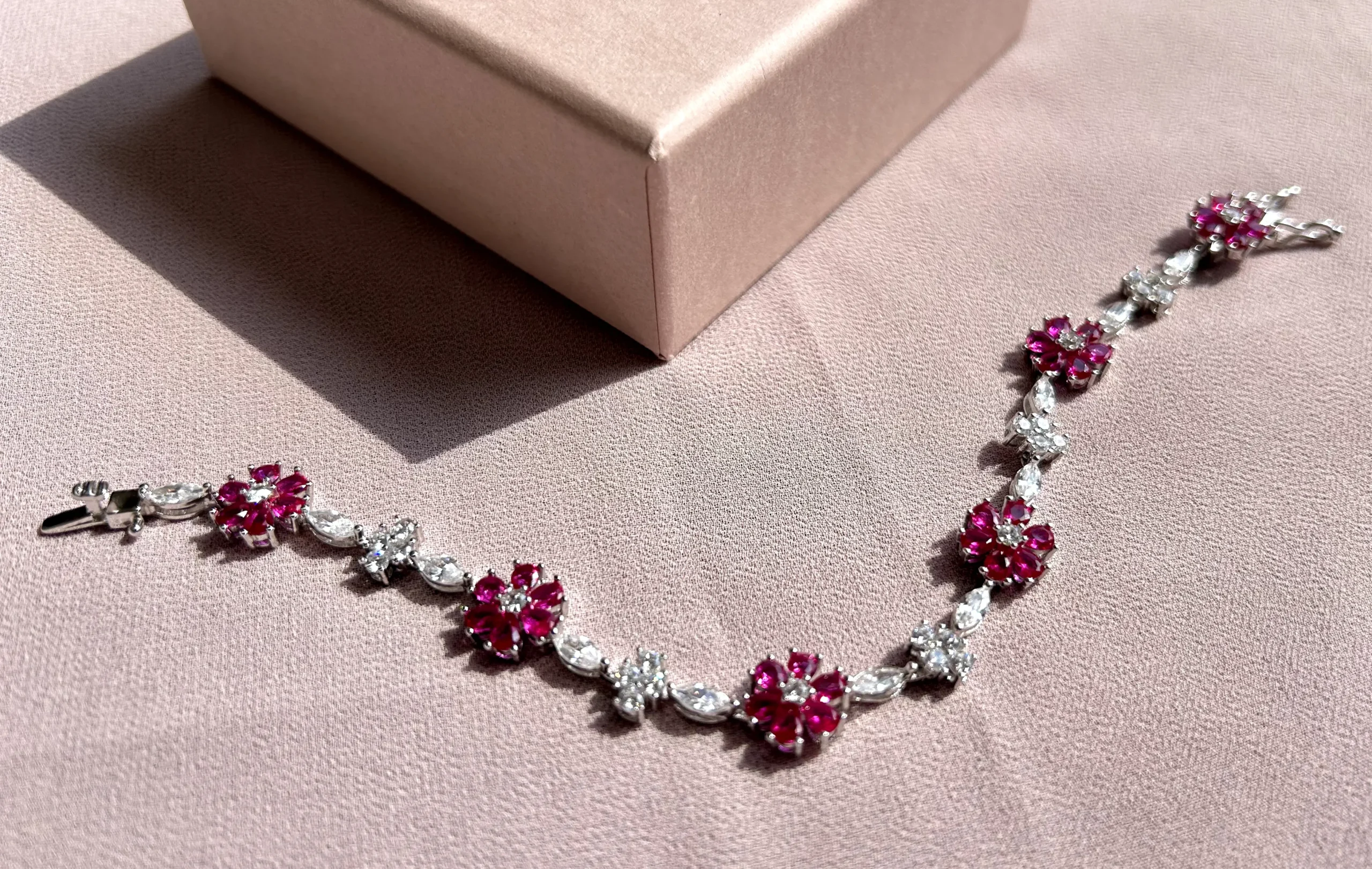 This bracelet is crafted with two flowers accents at each end, one with clear crystals and the other with deep rosy stones adding a vibrant contrast. The chain is lined with small, sparkling crystals for an added touch of luxury. Perfect for evening and formal events with a timeless appeal.