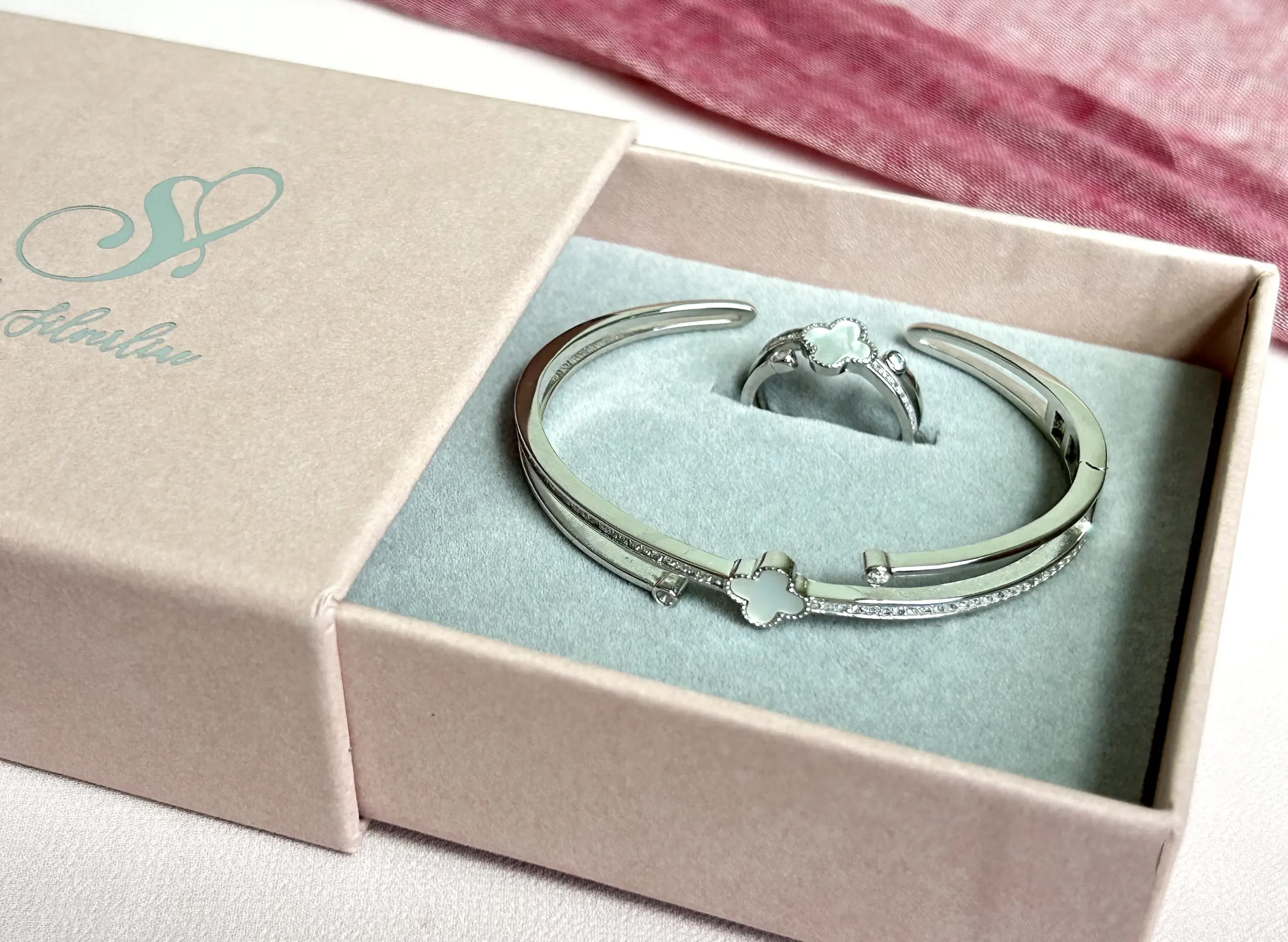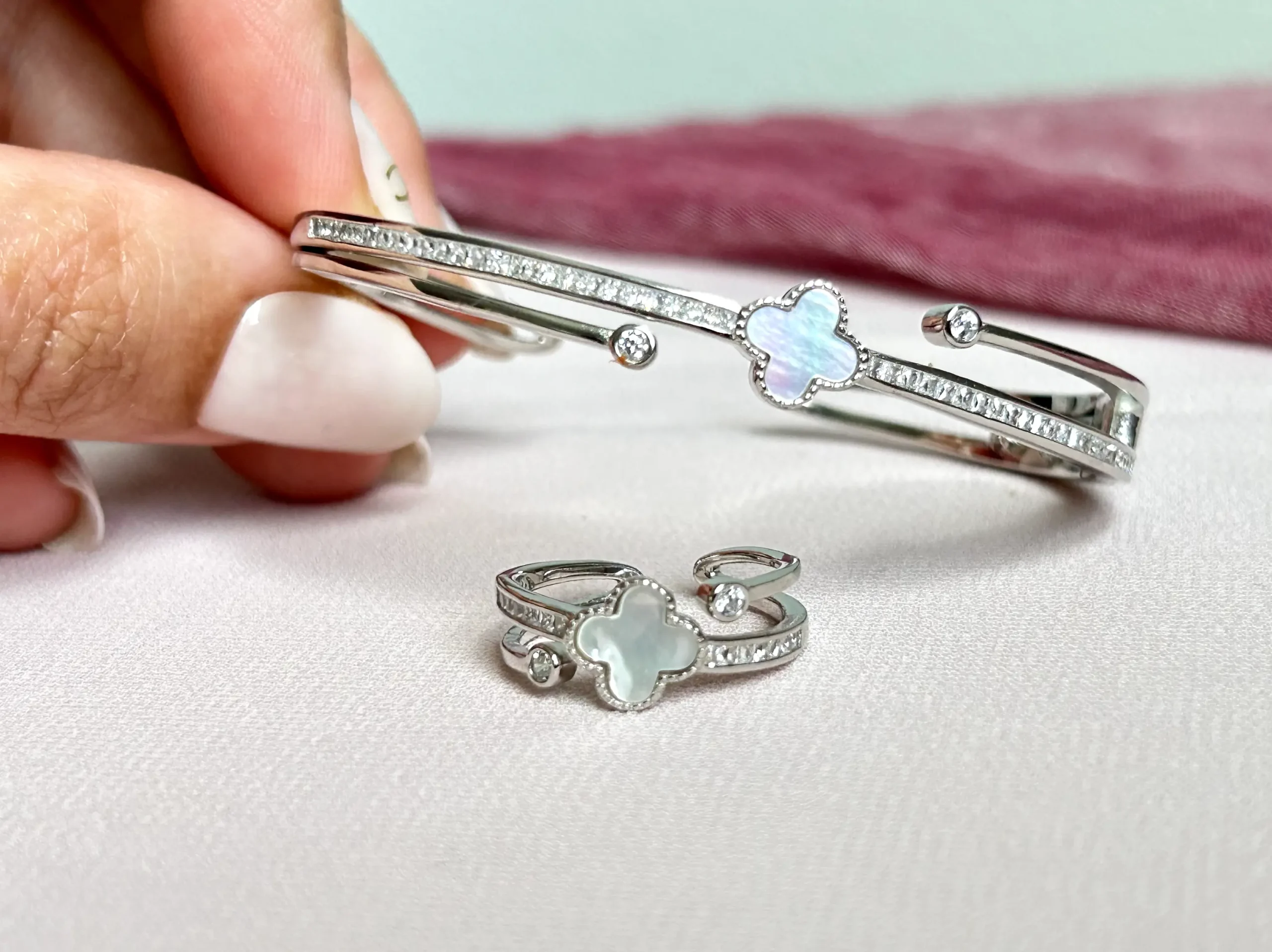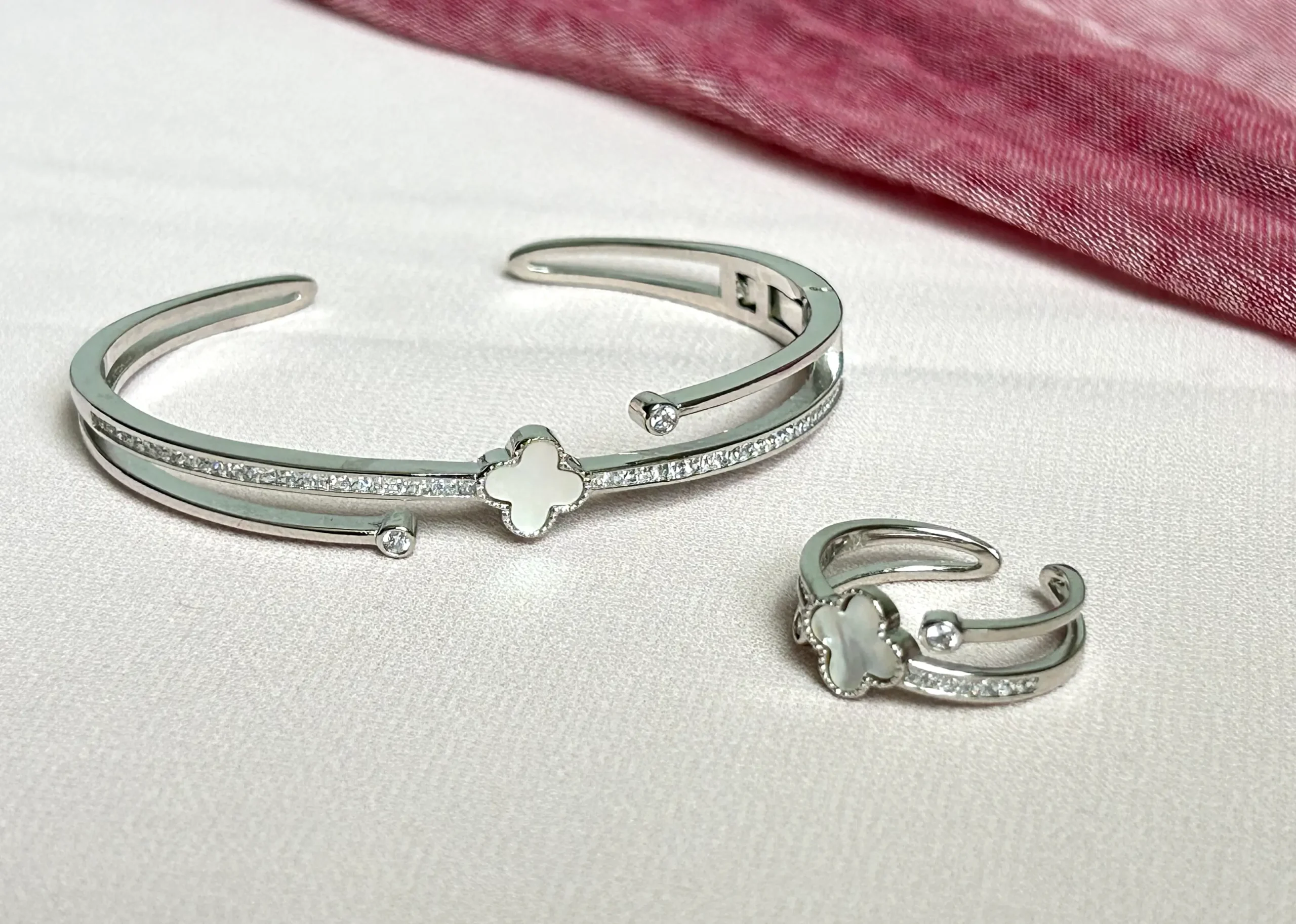 This set embodies a classic, elegant look with a four-leaf clover motif symbolizing luck and prosperity. Both the bangle and ring feature this motif as a central element, framed by small cubic zirconia accents.