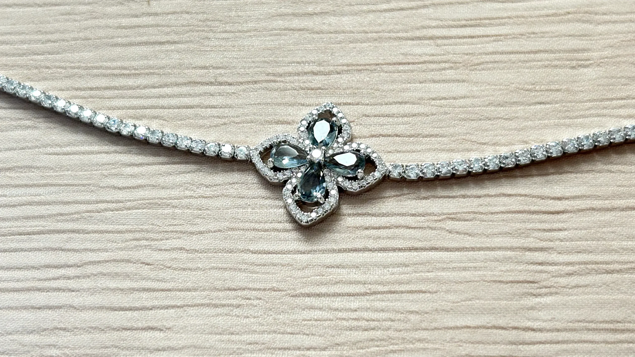 Tennis-style bracelet with a prominent floral charm at the center surrounded by clear stones along the chain.