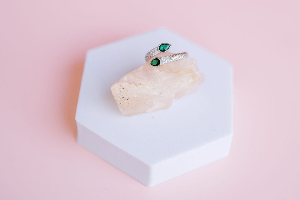 Two vibrant green stones resembling emeralds, adding a luxurious and fresh aesthetic.