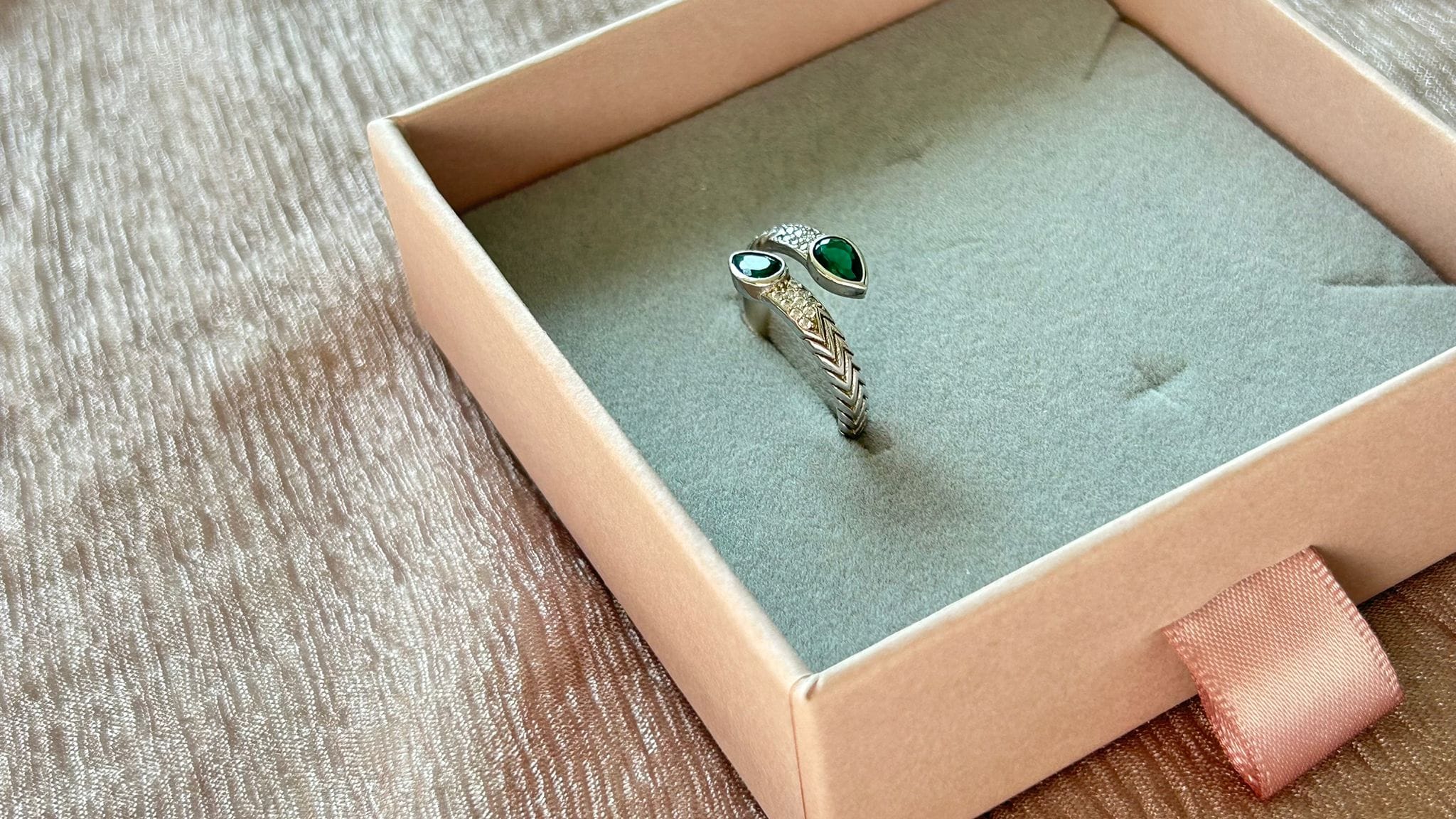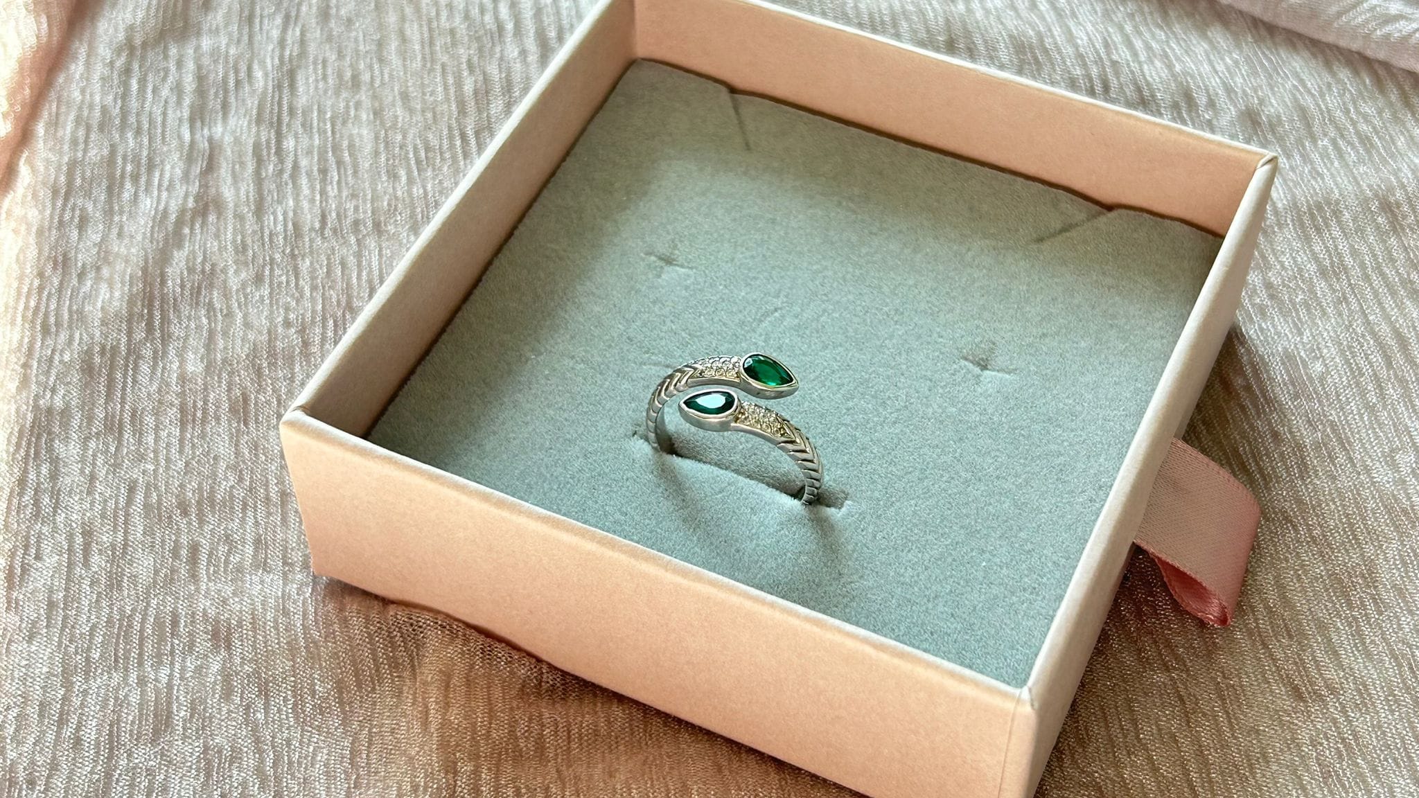 An elegant wrap-style ring featuring a symmetrical design with two teardrop-shaped green gemstones at either end, creating a modern yet timeless appeal.