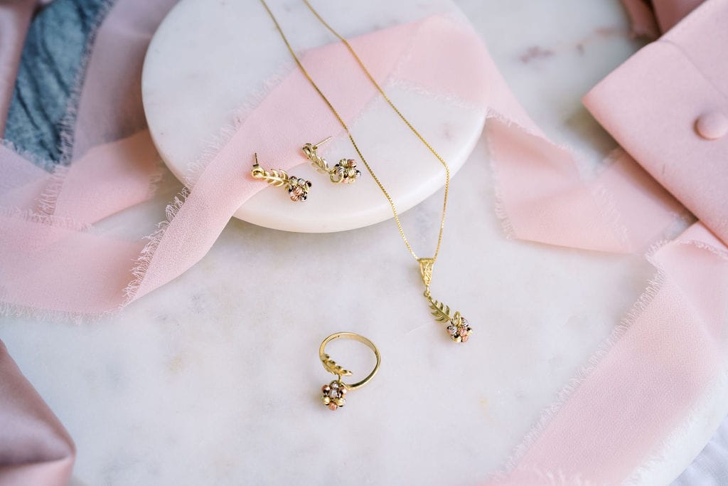 A matching set including a pendant necklace earrings, and a ring  featuring floral motifs with delicate leaf details.