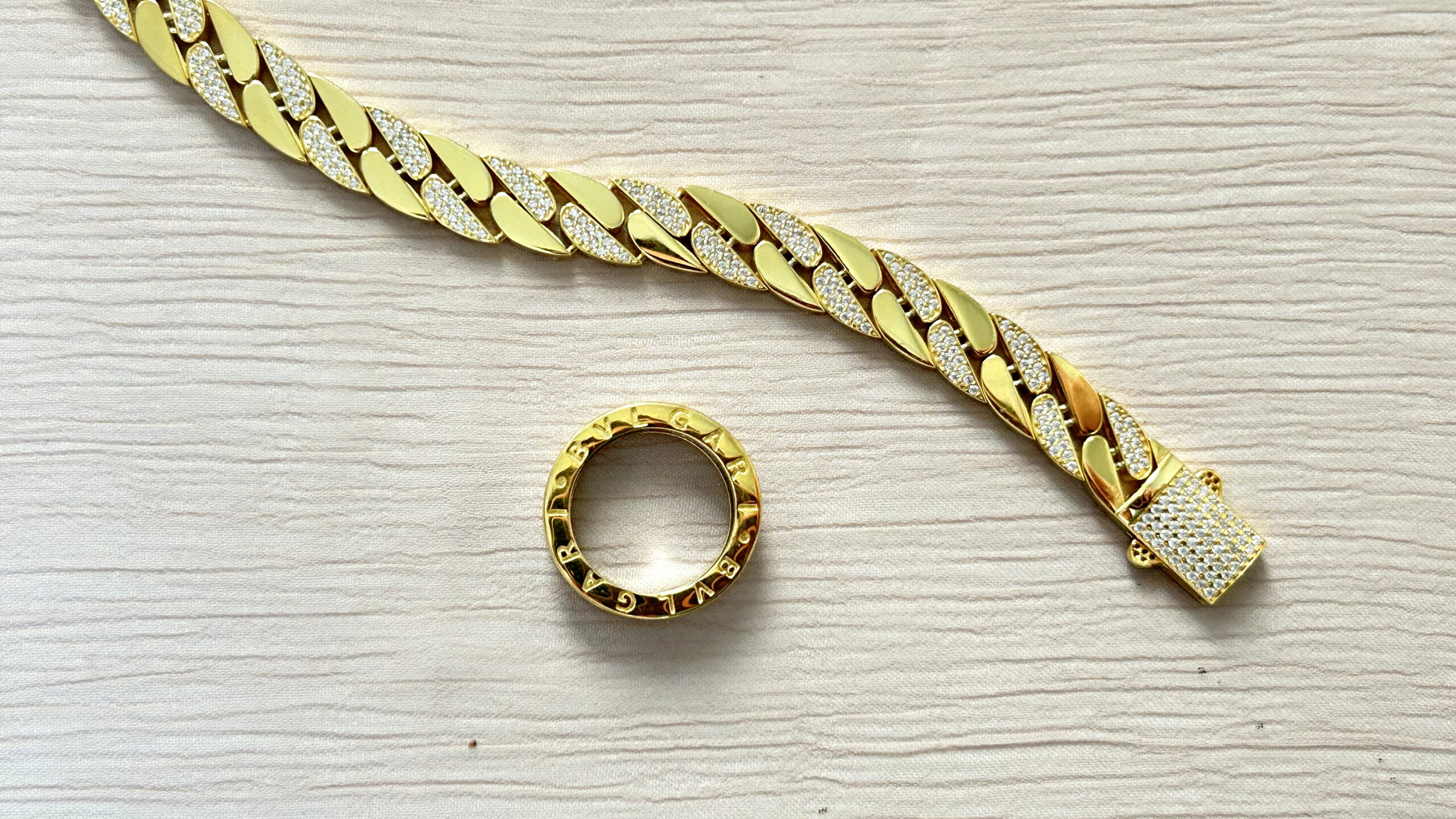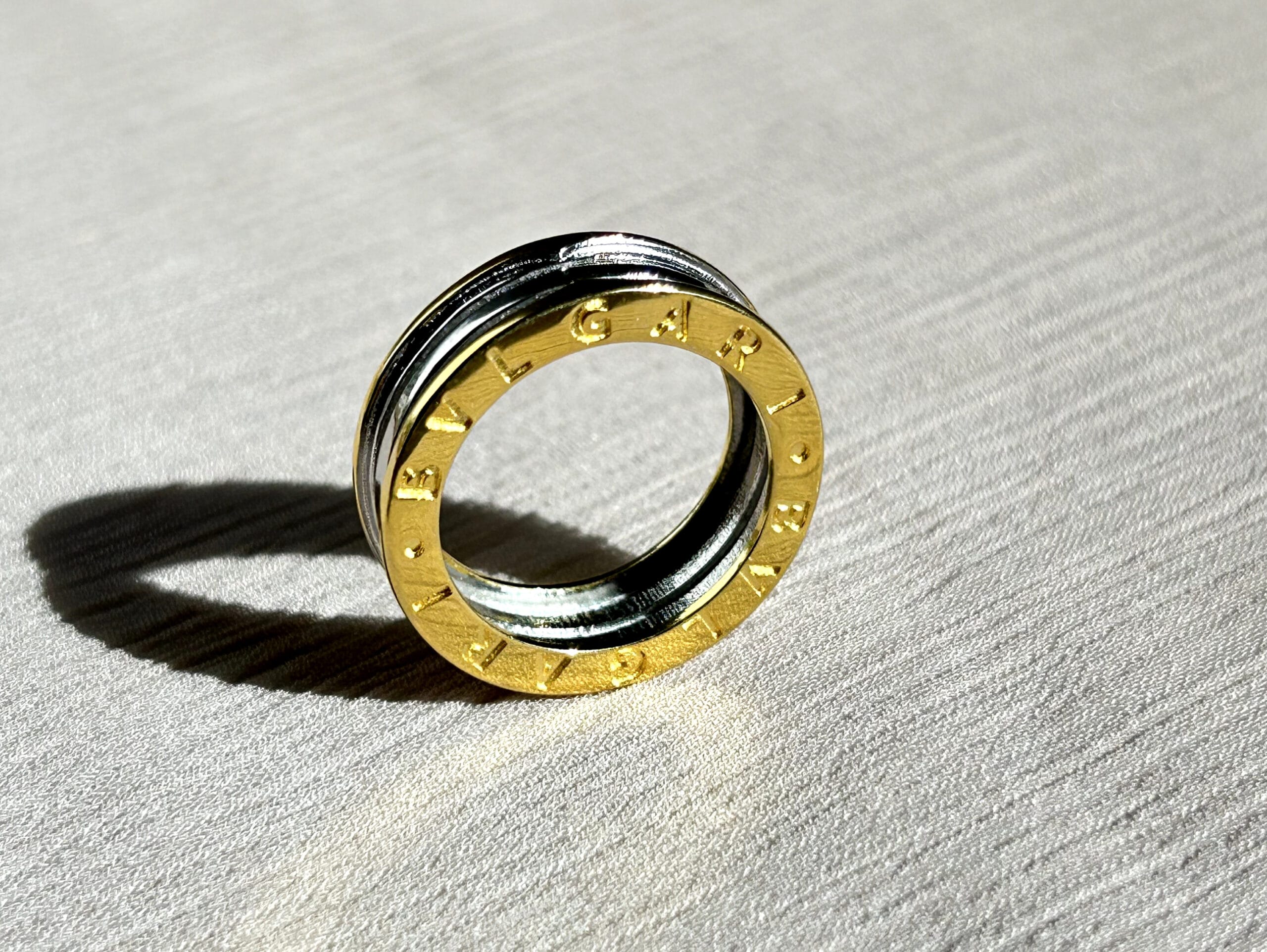 A bold and modern dual-tone ring featuring a circular design engraved with a luxury logo.